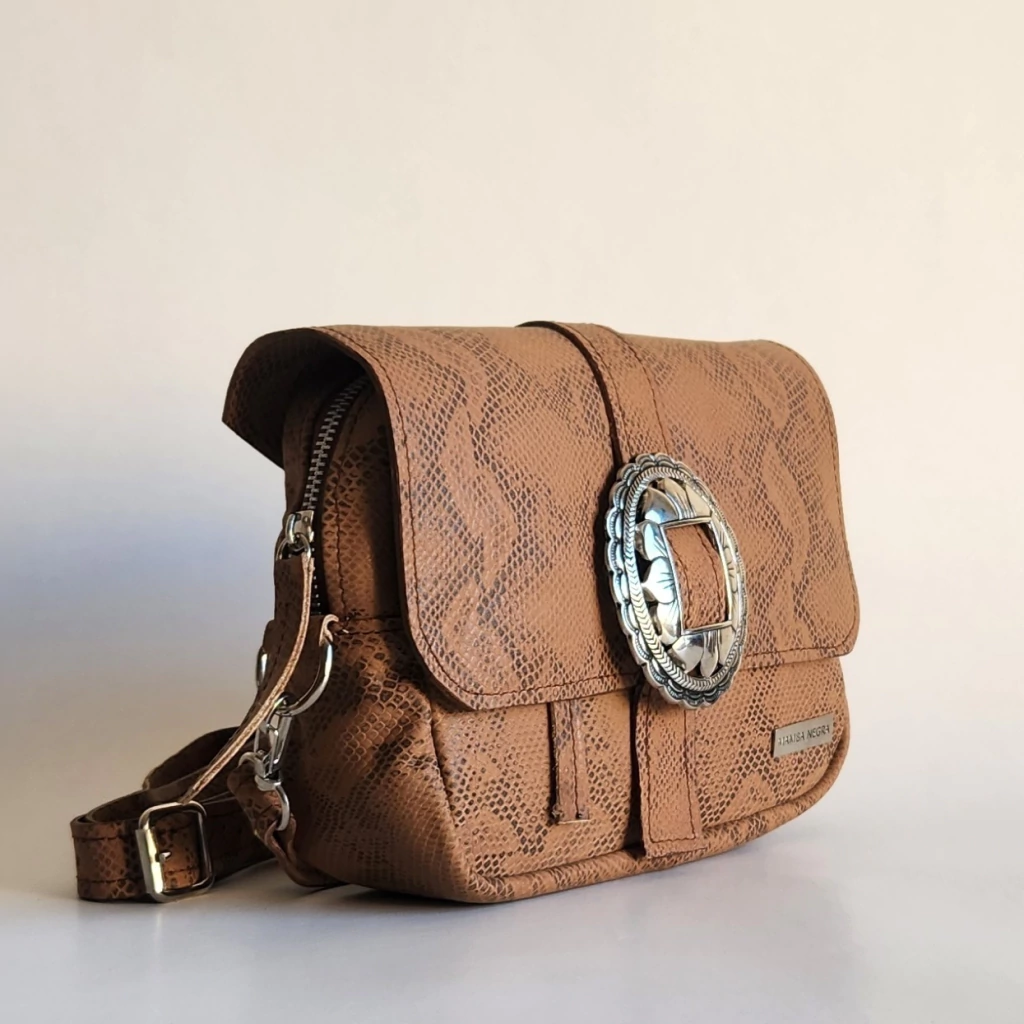 La Bandolera OLGA reptil suela es el accesorio perfecto para quienes buscan un diseño. Confeccionada en cuero con textura reptil negro, destaca por su hebilla único y elegante.